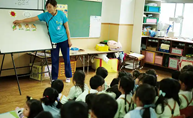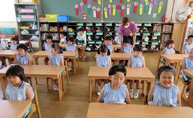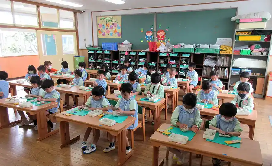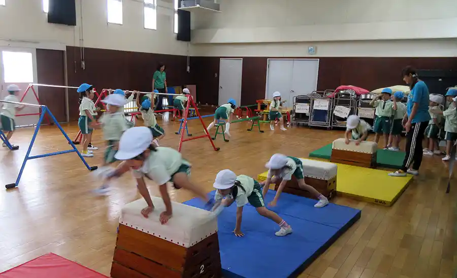 園児たちの朝は園長先生のお出迎えで始まります。朝の会では、目を閉じて背筋を立てて座り、心静かに黙想します。みんなで季節の歌を歌い、園庭や体育館で「体育あそびサーキット」で汗をかき、その後、お絵かきや歌、ピアニカの演奏など、クラスごとに活動します。