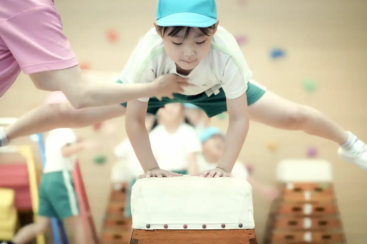 外部講師の指導により鉄棒や跳び箱などで元気よく体を動かします