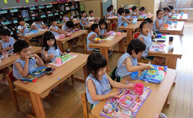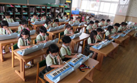 園児たちの朝は園長先生のお出迎えで始まります。朝の会では、目を閉じて背筋を立てて座り、心静かに黙想します。みんなで季節の歌を歌い、園庭や体育館で「体育あそびサーキット」で汗をかき、その後、お絵かきや歌、ピアニカの演奏など、クラスごとに活動します。