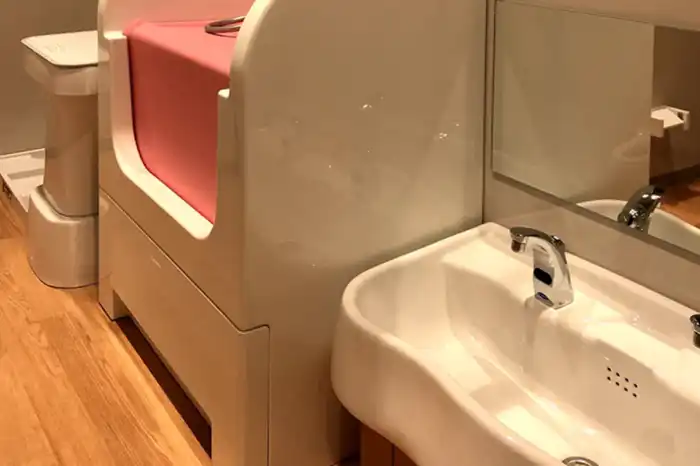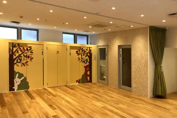 清潔でやさしさいっぱいの保育室。くまちゃんとうさぎさんのイラストでお迎えします。